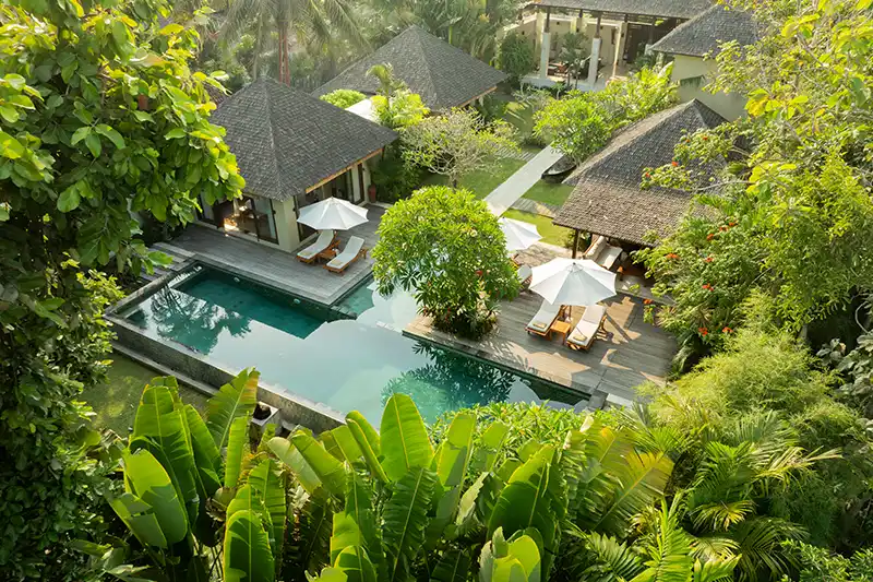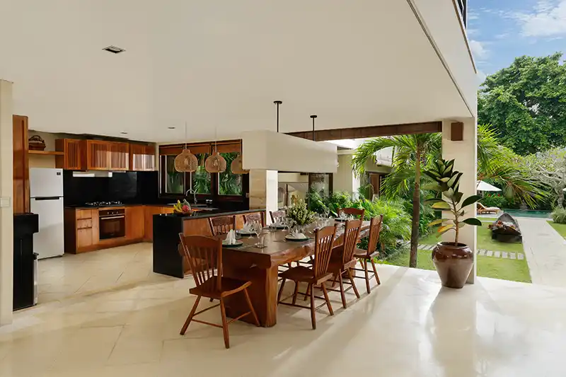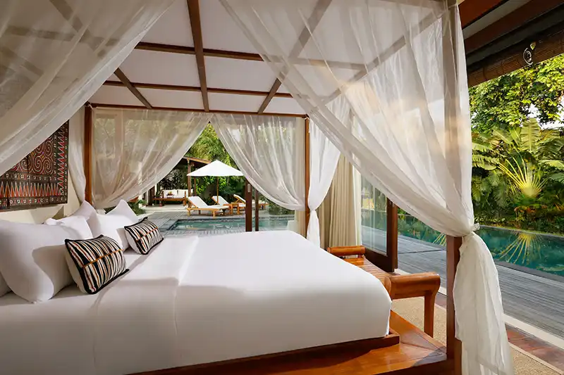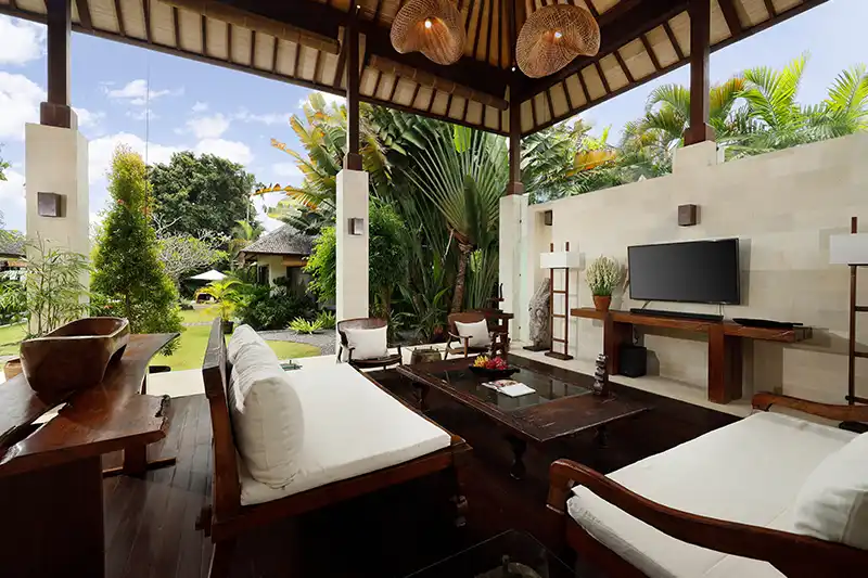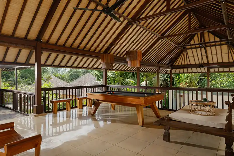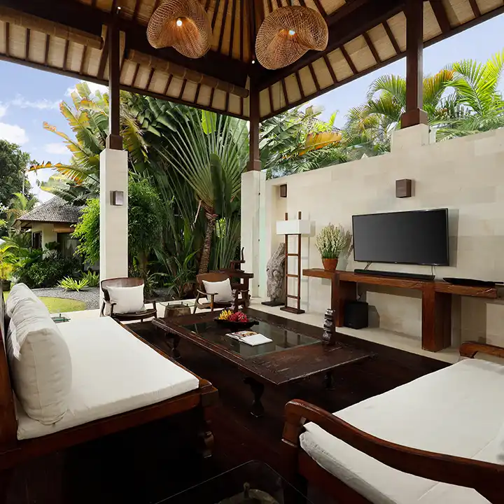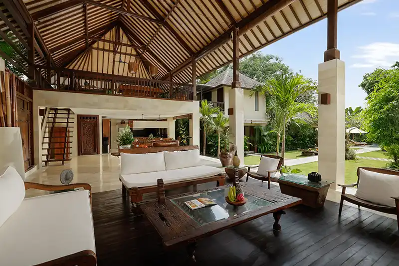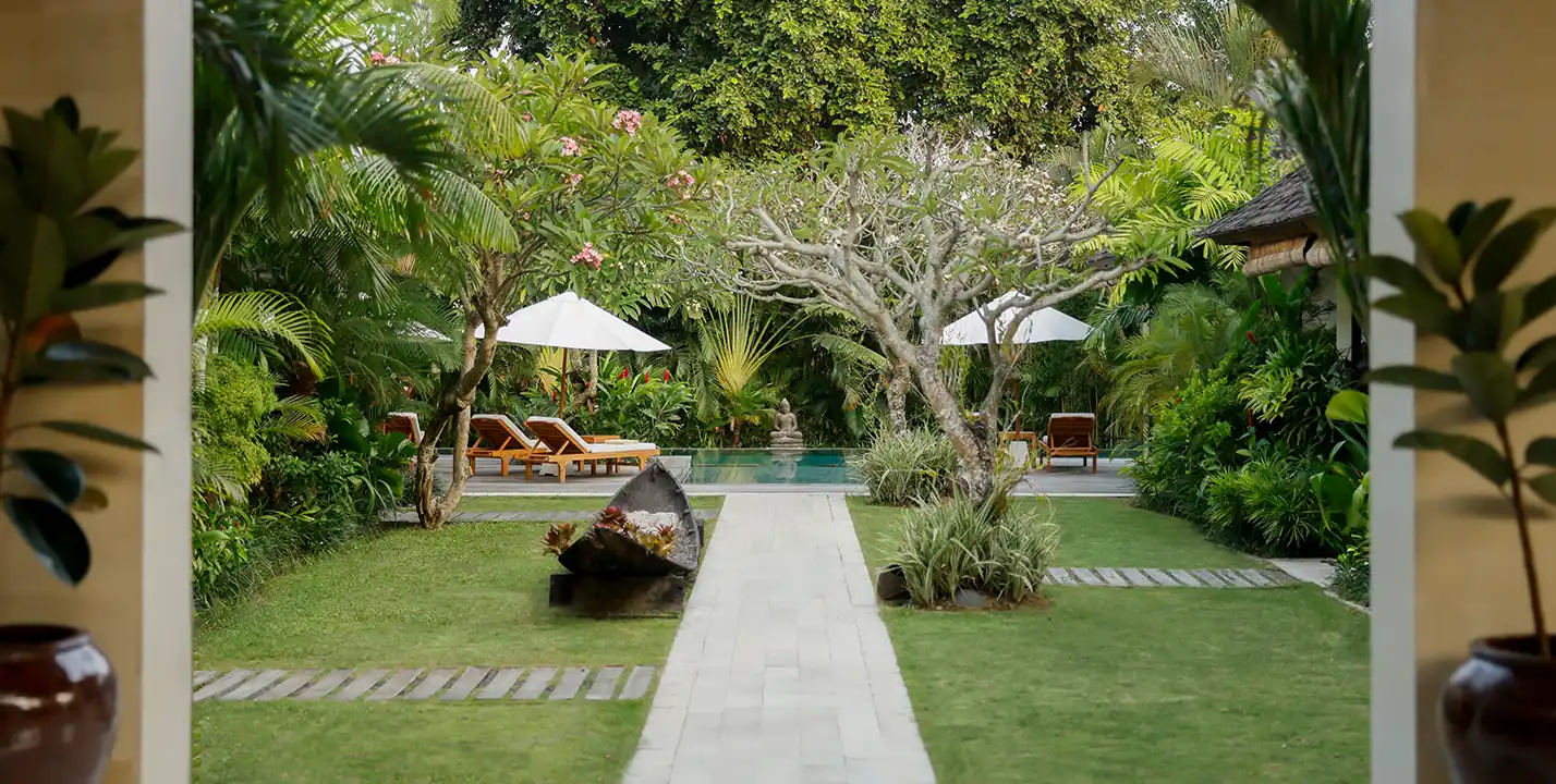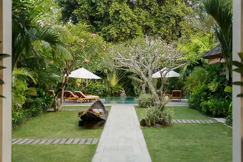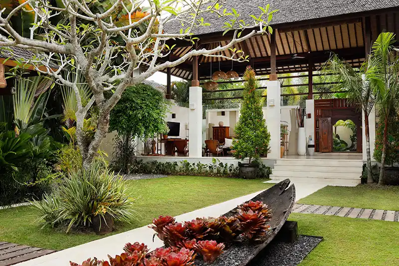 The Javanese entrance to the villa leads to an open-air common area, overlooking a beautiful T-shaped swimming pool and tropical Bali garden decorated with an antique fisherman or ‘nelayan’ boat, iconic to Villa Nelayan.