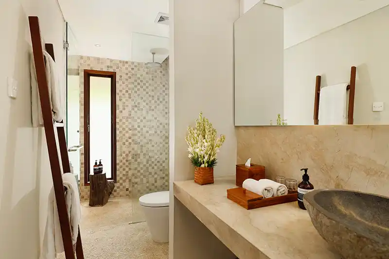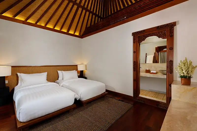 Villa Nelayan comprises 5 bedrooms (2 bedrooms with king-sized bed, 2 bedrooms with queen-sized bed and 1 with 2 single beds) tastefully designed and decorated, located in separate buildings with their own ensuite marble bathroom with outdoor rain shower and bath.
